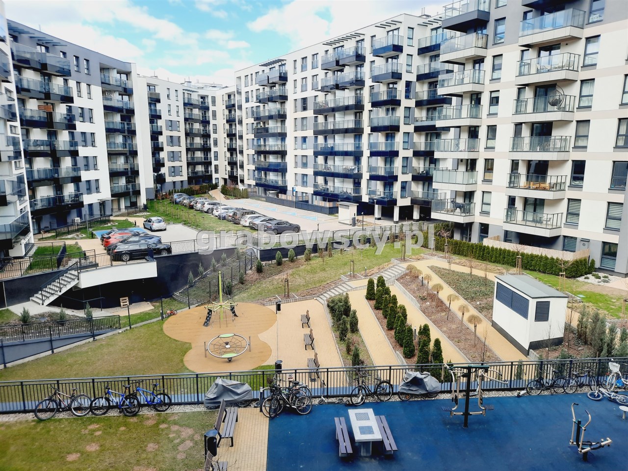 Przed budynkiem znajduje się dziedziniec z placem zabaw, siłownią oraz parkingiem przeznaczonym tylko dla mieszkańców.
